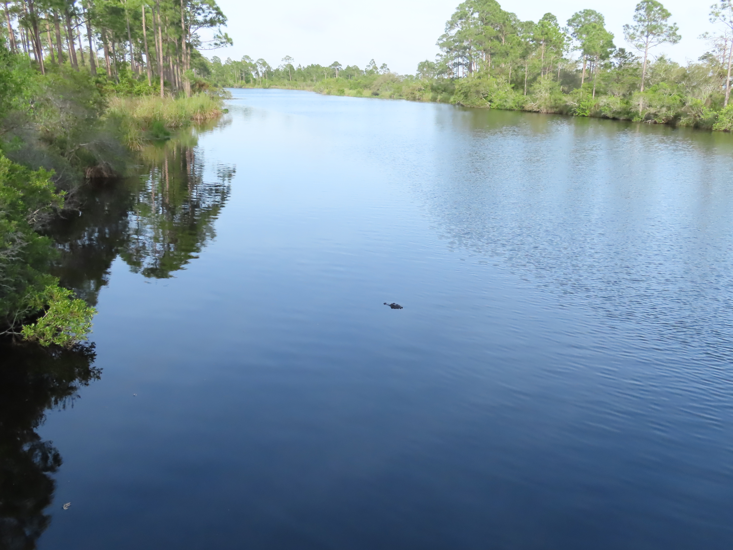 Na een heel klein stukje lopen komen we bij de Long Pond. Dat is het enige zoete water in het park en daar zouden alligators kunnen zitten. En ja hoor, meteen raak. 1 in het water en wat verderop nog 1, maar die duikt wel heel snel onder water. We lopen verder, links af en het ziet eruit als de Waalsdorpervlakte, maar dan anders ๐๐. Het zand is wit en de begroeiing is natuurlijk niet hetzelfde, maar het gevoel wel. Er staan naaldbomen, varens en lage palmen en het is er heel rustig. Een onbekend beest sprint voor ons langs, te snel om te kunnen zien wat het was.